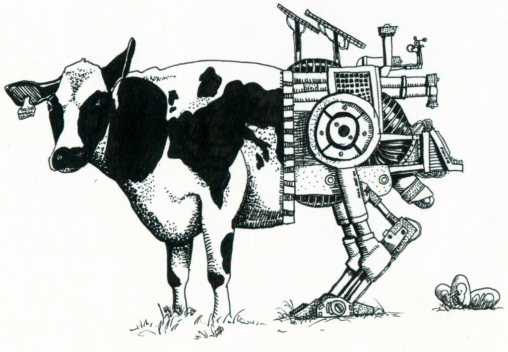 The collage by the German-Chilean artist Jorge Armando Ponce Muñoz consists of image fragments from his artistic animation film BIOMASA. The film is set in a future in which humans have almost abandoned their original physicality. In BIOMASA, the human becomes a cyborg, in art often a being with utopian potential, while in popular culture it is more often read as dystopian. The work raises philosophical, ethical, and anthropological questions about the relationship between humans and technology, particularly human-technology connections and the limits of self-optimization.